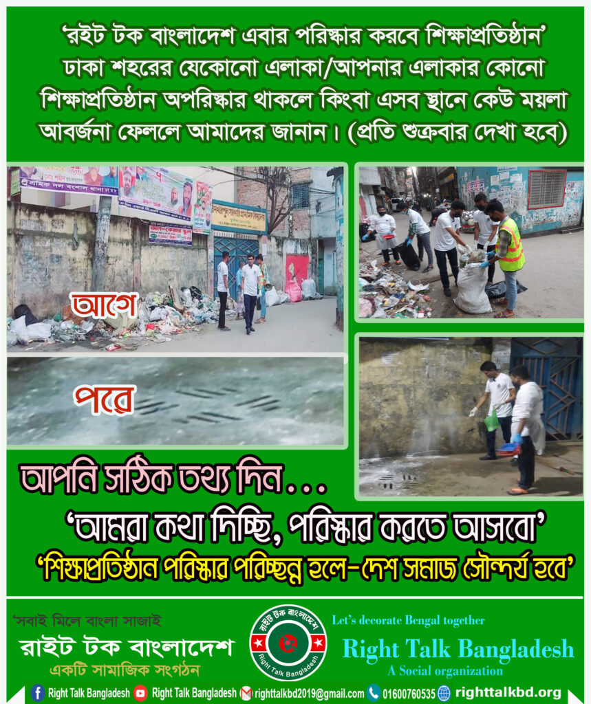 ঢাকা শহরের যেকোনো এলাকার সকল ধরনের শিক্ষাপ্রতিষ্ঠান অপরিস্কার থাকলে আমাদের রাইট টক বাংলাদেশকে জানান। দেখা হবে পরিস্কার হবে আপনার এলাকার শিক্ষাপ্রতিষ্ঠান।