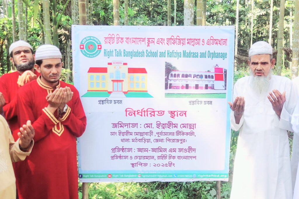 (৪ এপ্রিল ২০২৫) জুমার নামাজের পর পিরোজপুর জেলার মঠবাড়িয়া থানার পূর্বসেনের টিকিকাটা মোল্লাবাড়িতে “রাইট টক বাংলাদেশ স্কুল এবং হাফিজিয়া মাদরাসা ও এতিমখানা” এর প্রস্তাবিত প্রতিষ্ঠানের দোয়া ও মোনাজাত অনুষ্ঠিত হয়। এসময় জমিদাতা মো. ইব্রাহিম মোল্লা এবং রাইট টক বাংলাদেশ এর প্রতিষ্ঠাতা চেয়ারম্যান ইঞ্জিনিয়ার আল আমিন এম তাওহীদ উপস্থিত ছিলেন। এছাড়াও উপস্থিত ছিলেন, সেনাবাহিনীর সার্জেন্ট আমিনুল ইসলাম দুলালসহ আরো অনেকে। মহান আল্লাহ যেন রাইট টক বাংলাদেশ এর প্রথম প্রজেক্ট সফল করার তাওফিক দান করুন-আমিন। আলহামদুলিল্লাহ আমাদের এই স্বপ্ন সারাদেশে ছড়িয়ে যাবে, একদম প্রত্যন্ত অঞ্চলে শিক্ষার আলো ছড়িয়ে দিতে আমাদের এই মহান কাজের ধারা অব্যাহত থাকবে।