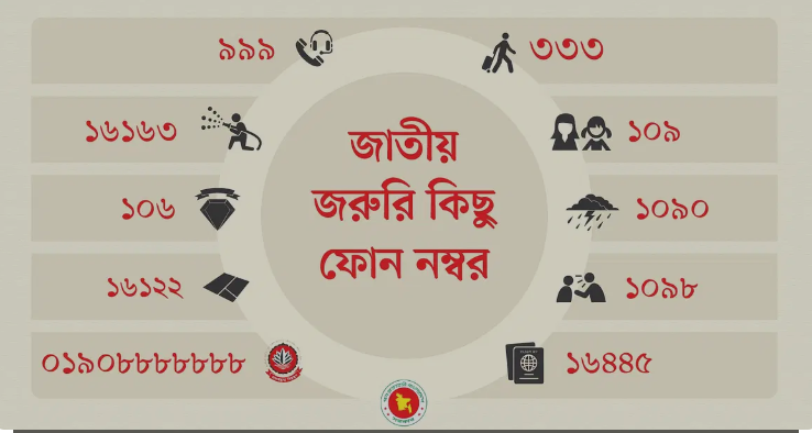 ১ ন্যাশনাল ইমার্জেন্সি সার্ভিস – ৯৯৯ ২ ৩৩৩ কল সেন্টার ৩ কৃষি কল সেন্টার (১৬১২৩) ৪ প্রবাসীদের জন্য কল সেন্টার (প্রবাসী কল্যাণ ও বৈদেশিক কর্মসংস্থান মন্ত্রণালয়) ৫ গ্রাহক পরামর্শ বক্স…